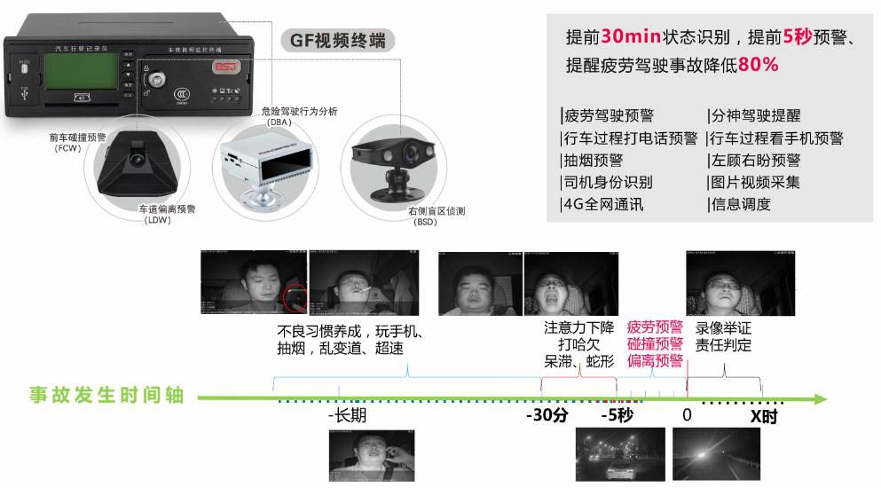 主要是監(jiān)測駕駛?cè)藛T在車輛行駛過程中抽煙、打電話、未系安全帶等違規(guī)行為,同時傳送云端后臺,對其行為進行分析、糾正和培訓改善,提前預防交通事故發(fā)生。
